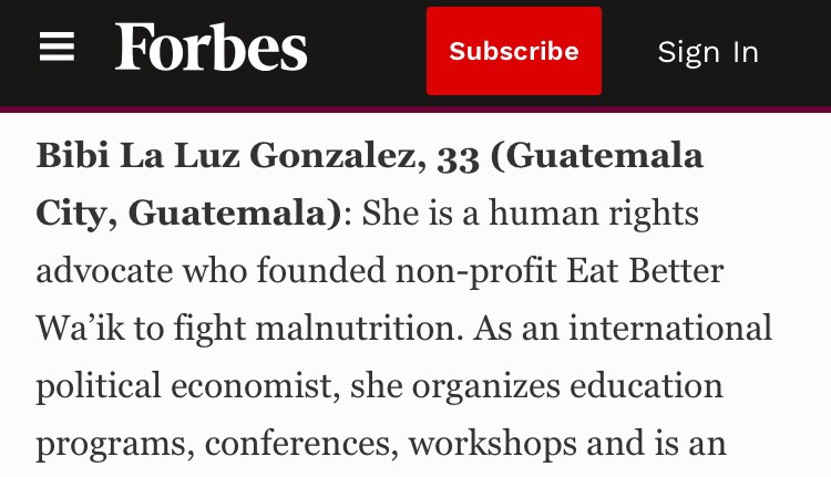Nos adelantamos al 2021, casi seis años luego de la publicación en Forbes México. Aparecemos aquí en la nota en inglés (y con nuestro nombre en inglés Eat Better Wa’ik), en la nota publicada al momento que se hizo pública el listado de los 50Next. Esta lista reunió a 50 jóvenes alrededor del mundo que están transformando el futuro de la gastronomía organizado por The World’s 50 Best Restaurants y el Basque Culinary Institute. Bibi la Luz figura en la categoría de «Activistas Pioneras» o «Trailblazing Activist». Mira su perfil aquí.